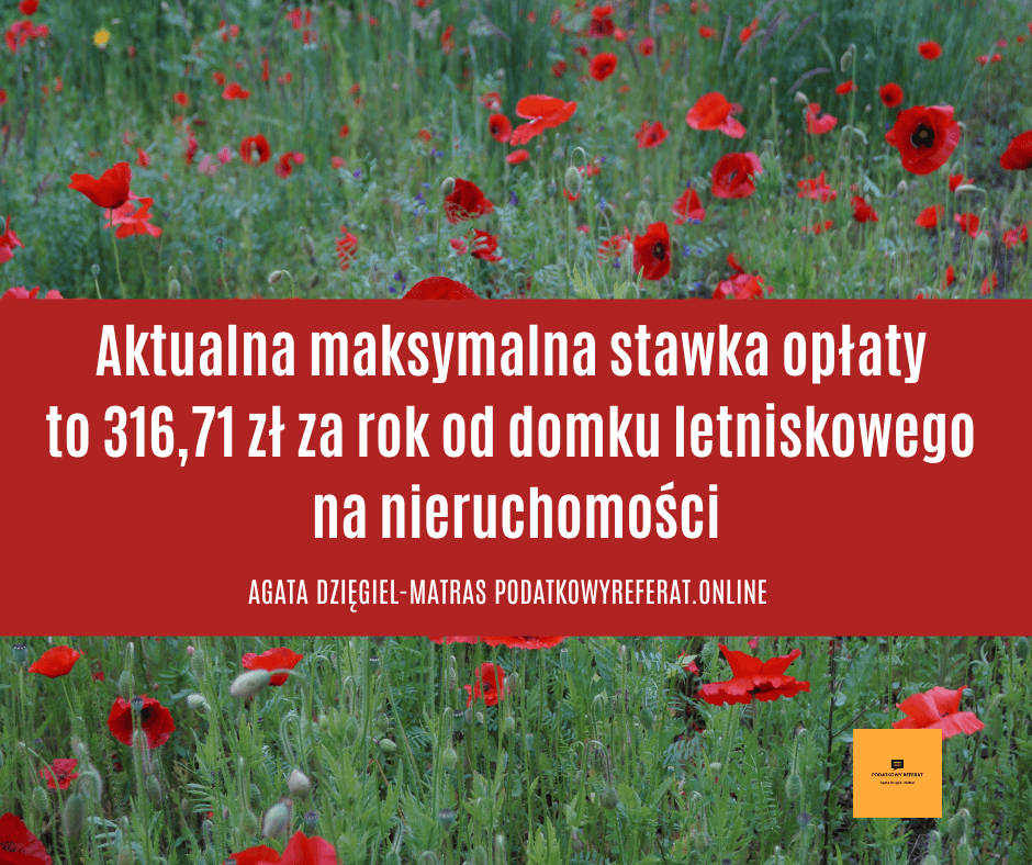 Aktualna maksymalna stawka opłaty to 316,71 zł za za rok od domku letniskowego na nieruchomości.