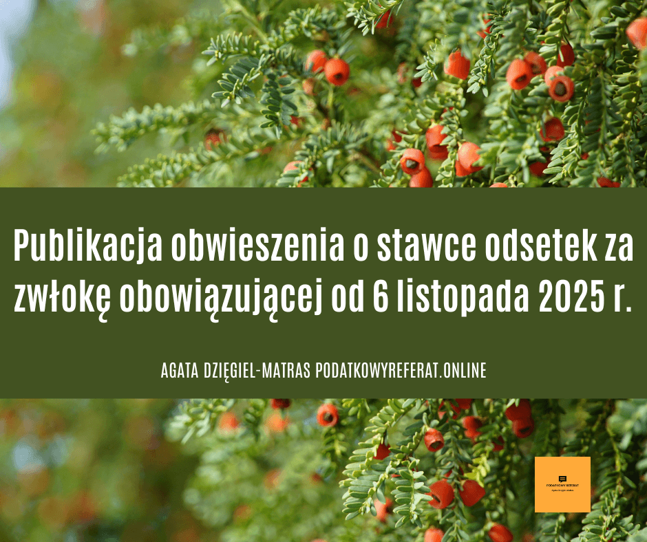 W M. P. poz. 1208 z 26 listopada 2025 r. zostało opublikowane obwieszczenie Ministra Finansów i Gospodarki z dnia 22 listopada 2025 r. w sprawie stawki odsetek za zwłokę od zaległości podatkowych, obniżonej stawki odsetek za zwłokę od zaległości podatkowych oraz podwyższonej stawki odsetek za zwłokę od zaległości podatkowych.